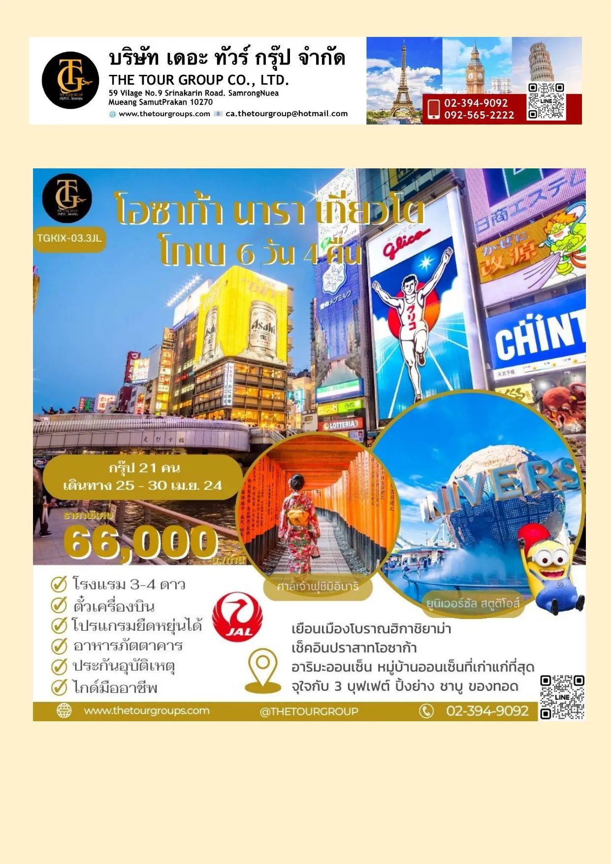 TGKIX-03.3JL โอซาก้า นารา เกียวโต โกเบ 6D4N เดินทาง 25-30 APR 24